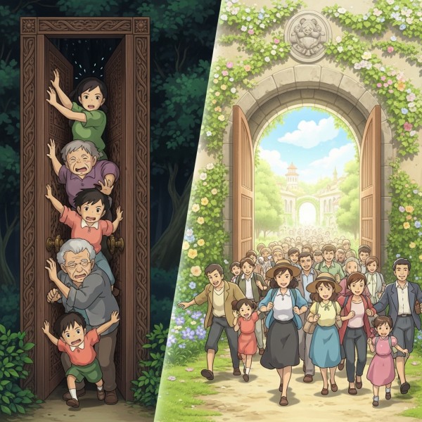 주님은 많은 사람들에게 좁은 문으로 들어가라고 말씀하십니다. 누가복음 13:24절에도 같은 말씀이 나옵니다. 누가복음 13:24 좁은 문으로 들어가기를 힘쓰라 내가 너희에게 이르노니 들어가기를 구하여도 못하는 자가 많으리라 마태복음에서는 좁은 문은 생명으로 인도하는 문이고 넓은 문은 멸망으로 인도하는 문이라고 했습니다. 좁은 문은 작고 그 문으로 들어가는 길이 협착(狹窄)하여 찾는 사람이 적으며, 멸망으로 들어가는 문은 크고 그 길이 넓어 찾는 사람이 많다고 하셨습니다(마태복음 7:13~14)대신 좁은 문으로 들어가는 사람들은 천국잔치에 참여할 수 있습니다. 넓은 문으로 들어가면 멸망하게 된다는 것을 알 수 있습니다. 많은 사람들이 쫓겨난 이유는 넓은 문을 구원의 문으로 오해했기 때문입니다. 사람들인 넓은 문으로 들어간 이유는 그것이 좁은 문인 줄 알았기 때문입니다. ​왜 넓은 문을 좁은 문으로 오해했을까요? 첫째, 하나님께서 구원의 문은 좁고 협착하게 만드시고 멸망의 문은 넓고 크게 만드셨다고 오해하기 때문입니다. 하나님은 공평하시며 차별이 없으십니다. 모든 사람들에게 똑같이 구원의 문을 열어놓으셨습니다. 그러므로 좁은 문과 넓은 문은 우리가 스스로가 만든 문입니다.