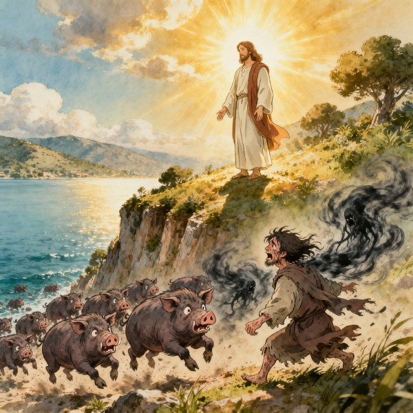 오늘은 저 유명한 거라사 광인에 대한 사건입니다. 마태복음에는 가다라 지방이라고 하고, 마가와 누가는 거라사라고 말합니다. 이 지역은 데가볼리라는 이방읻들의 도시에 속해 있습니다. 주님은 배를 타고 거라사에 오셔서 광인을 만나셨습니다. 또 마가와 누가에는 예수님이 귀신에게 “네 이름이 무엇이냐”고 물으실 때 ‘군대’라고 대답합니다. 사람들은 광인을 착고와 쇠사슬로 묶었으나 사나워서 모든 것을 끊고 도망쳤습니다. 그는 무덤에 머물면서 지나가는 사람들을 괴롭혔습니다. 그 때 주님께서 거라사의 광인을 만나셨습니다. 거라사 광인은 예수님 앞에 엎드려서 간구합니다. 29.이에 그들이 소리 질러 이르되 하나님의 아들이여 우리가 당신과 무슨 상관이 있나이까 때가 이르기 전에 우리를 괴롭게 하려고 여기 오셨나이까 하더니 30.마침 멀리서 많은 돼지 떼가 먹고 있는지라 31.귀신들이 예수께 간구하여 이르되 만일 우리를 쫓아 내시려면 돼지 떼에 들여 보내 주소서 하니 예수님은 우리를 구하시고 악한 귀신을 멸하시기 위하여 오셨습니다. 광인 안에 있는 군대귀신은 예수님을 두려워했습니다. 귀신들은 아직 마지막 때가 이르지 않았지만 자신들을 소멸시킬 것을 두려워했습니다. 그래서 예수님께 간청했습니다. 여기서 우리는 귀신의 한계를 분명히 알아야 합니다. 마귀나 귀신은 하나님의 형상으로 지은 사람을 대상으로 삼습니다. 오직 사람만이 그 안에 영이 있기 때문입니다. 그러므로 귀신은 두 가지 한계가 있습니다. 첫째, 귀신은 주를 믿는 자를 해하지 못합니다. 둘째, 귀신은 육체가 없기 때문에 아무 능력이 없습니다. 귀신은 우리의 두려움과 낙심, 염려와 근심을 밥으로 삼습니다. 우리가 성령 안에서 항상 기뻐하고 쉬지 말고 기도하며, 범사에 감사하면 악한 마귀와 귀신들을 능히 대적할 수 있습니다. 예수님을 만난 군대 귀신은 그 사람 대신 돼지 떼에 들어가기를 구합니다. 예수님이 허락하셔서 돼지 떼에 들어간 귀신들은 돼지 떼를 내몰아 바다에 빠트렸습니다. 귀신들이 돼지 떼에 들어갔지만, 그 속에 영이 없어 자멸하고 말았습니다.